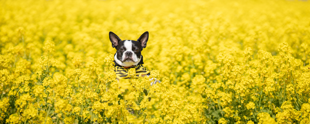 モグ先生を菜の花畑で撮影した写真作品「黄に漂う」